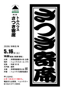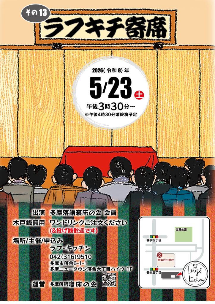 2026-02-13 / 最終更新日時 : 2026-03-19 nedoko 出張落語会 5月23日(土)15:30 第13回ラフキチ寄席(落合ラフキッチン) 弦六、駒太、玉女の3人でご機嫌を伺います。 今回も、15時30分開演なので、お間違えのないよう お越しください。よろしくお願いします。 Follow me! FacebookXBlueskyHatena