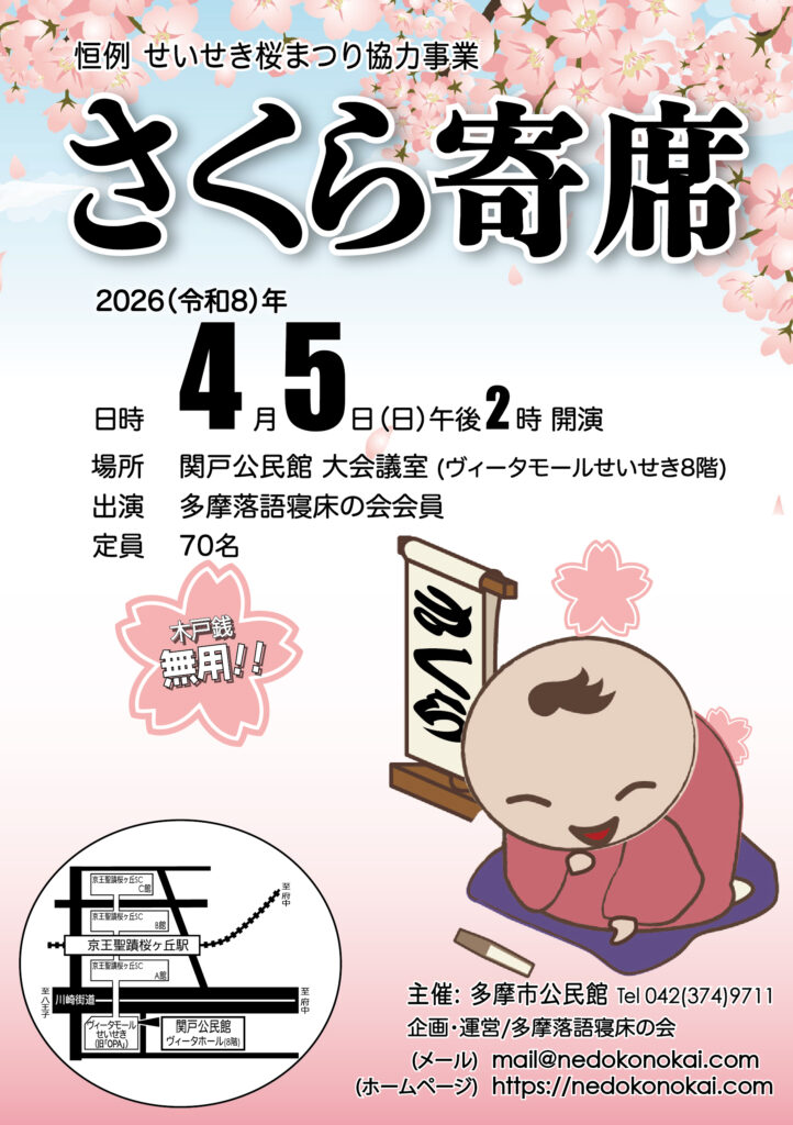 2026-03-20 / 最終更新日時 : 2026-03-20 nedoko 寝床の会落語会 4月5日(日) 14:00 さくら寄席(関戸公民館大会議室) せいせき桜まつり協力事業として、もうおなじみになりました、 さくら寄席を今年も開催します。 日時 4月5日(日)14:00から 場所 関戸公民館大会議室(ヴィータモールせいせき8階) 木戸銭 無用 主催・問合せ 関戸公民館(374-9711) Follow me! FacebookXBlueskyHatena